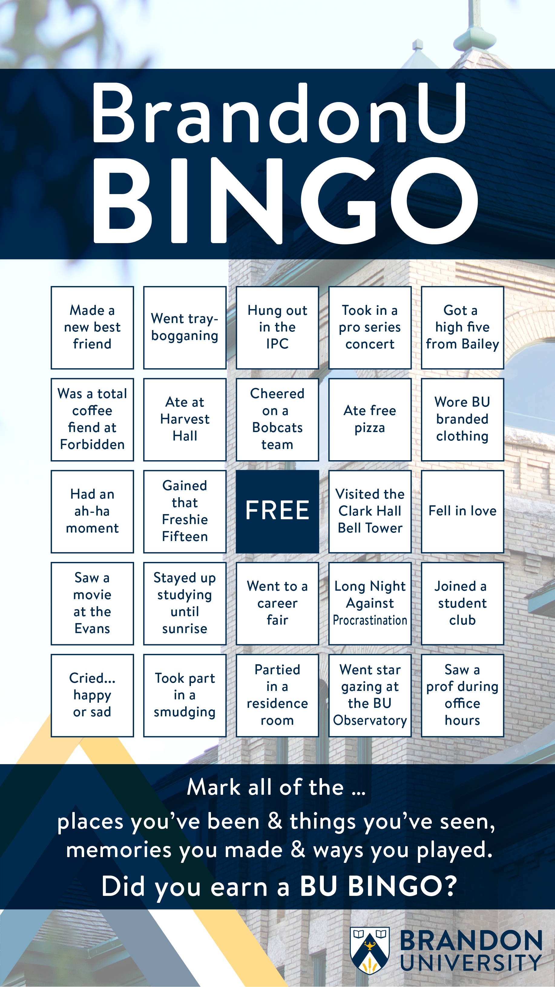 We’ve attached a BU Bingo card. Simply post it to your story on social media, and mark off the memories you have of your time at BU. Share with your fellow grads, and tag @BrandonUni as well. We can’t wait to see who got a Bingo!