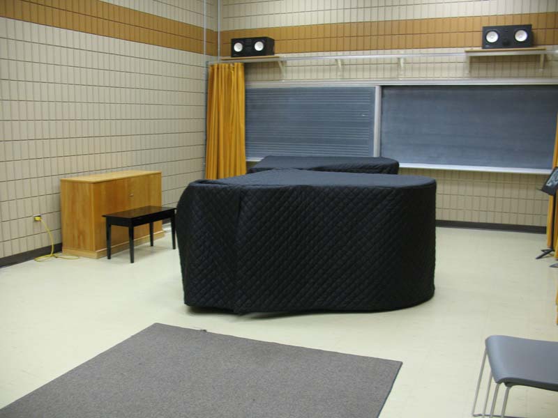 | room description | ensemble room 29.5 ft x 17.5 ft open room, 2 chalk boards, 2 pianos, 3 piano benches, curtains on two walls |