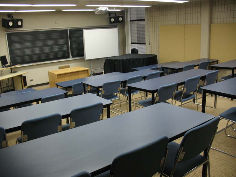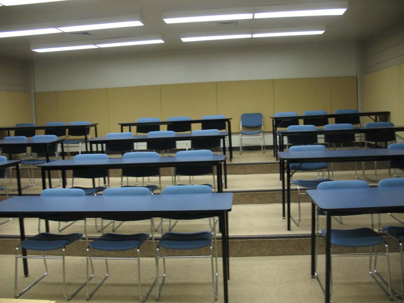 | lighting, sound | no windows, overhead lighting, control at door and from front of class, acoustical boards, carpeted floor, acoustical tiles on ceiling and walls |