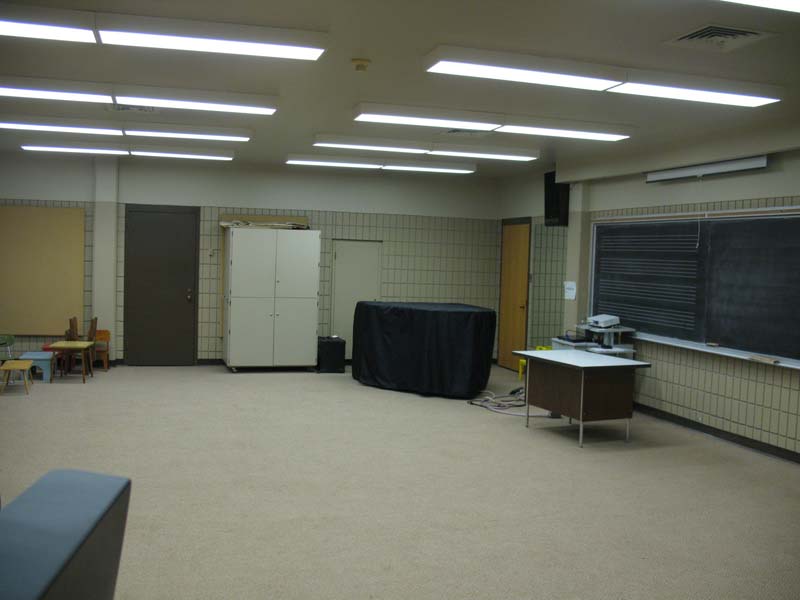 | lighting, sound | no window, overhead lighting, control at door and near the chalk board, hardwood flooring, acoustical tiles on ceiling and walls |