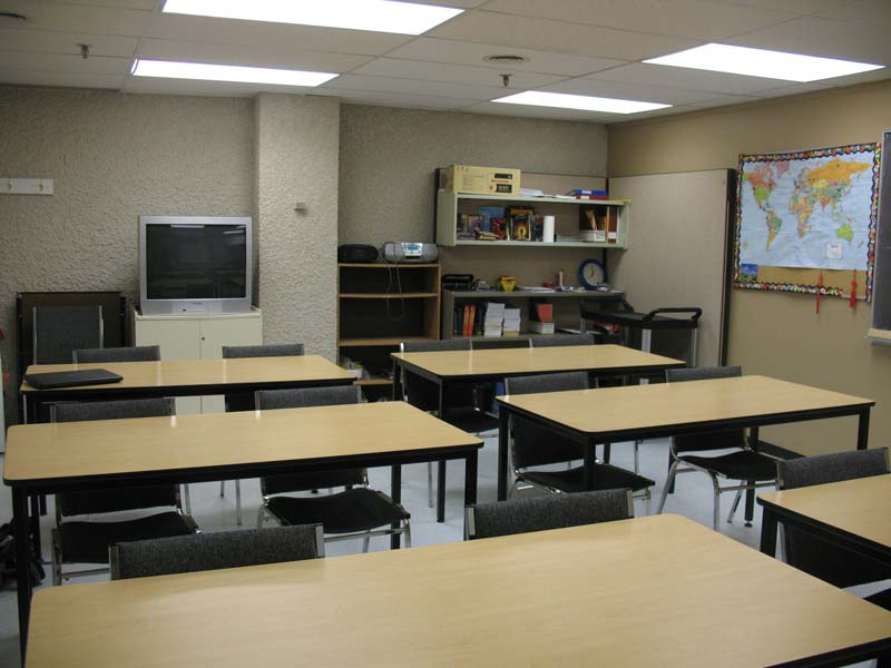 | furniture | 6 tables,16 chairs, 1 trapezoid table, 1 moveable cabinet used as podium, 1 fixed cabinet, |